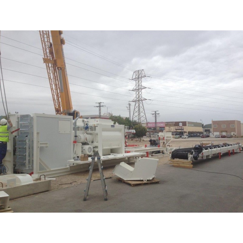 El Módulo de carga incluye la cinta elevadora de áridos, con todos sus accesorios ya instalados, el módulo de básculas, la plataforma de la mezcladora, de diseño modular y montaje mediante pasadores, y la mezcladora de doble eje horizontal. Este módulo, al igual que el anterior, va totalmente preinstalado de fábrica y requiere de un tiempo mínimo para su ensamblaje final.